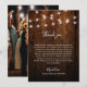 This rustic wedding thank you card features a warm and inviting design with a dark wood background and softly glowing string lights, creating a cosy and elegant aesthetic. The combination of script and serif fonts adds a touch of charm and sophistication, making it perfect for country, barn, or outdoor weddings. The heartfelt message expresses gratitude for the love, support, and gifts from family and friends, making it a meaningful keepsake. The back of the card beautifully showcases a romantic wedding photo, capturing the joy and magic of the celebration. Ideal for couples looking for a personalised and stylish way to thank their guests, this card exudes warmth, love, and timeless elegance.