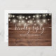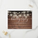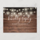 A rustic RSVP card with pretty string lights and chic typography on a wood panels background. The reverse features your details and a fun guest song request. Designed by Thisisnotme©