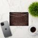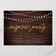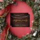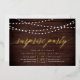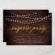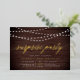 Our festive surprise party invitations feature a rustic wood plank background with strings of glowy white lights across the top, and "surprise party" in chic gold foil calligraphy script typography. Personalise with your surprise celebration details beneath in white; can be used for any occasion, like birthday parties or anniversary parties.