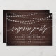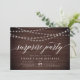 Our festive surprise party invitations feature a rustic wood plank background with strings of glowy white lights across the top, and "surprise party" in chic calligraphy script typography. Personalise with your surprise celebration details beneath in white; can be used for any occasion, like birthday parties or anniversary parties.