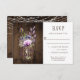 Rustic RSVPs featuring a mason jar filled with violet, purple, and lavender wildflowers with baby's breath and greenery and adorned with a purple ribbon. The back of the card features white string lights with a pale violet mason jar over a weathered barn wood background. If you would like this design on a matching product, or need help, please contact me through my store.