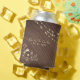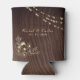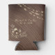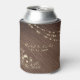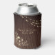 Rustic wedding can cooler with faux wood grain, elegant gold floral line art, and glowing string lights. Personalised with couple’s names and wedding date. Perfect keepsake or party favour for receptions or welcome parties.