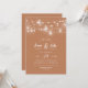 Affordable custom printed wedding invitations with an easy to use template for customisation. This rustic chic design features strands of glowing string lights and mason jars on a dusty terra cotta background. Personalise the invite with your wedding details or customise the text to use for any event. Use the design tools to choose any background colour, add photos and customise the text fonts and colours to make a unique design for your wedding.
