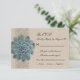 This elegant wedding response card features a rustic background and a big picture of a succulent plant on the left. A lace border adds a chic look with a vintage touch. The information is written in elegant lettering. This design is ideal for a wedding with a botanical, rustic, or outdoors theme. It’s perfect for nature lovers with a sophisticated taste.