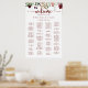 This rustic summer floral alphabetical seating chart is perfect for a simple wedding. The design features burgundy, pink and blush watercolor flowers with green leaves in a brownish stained background.
