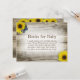 Rustic, weathered wood with yellow sunflowers and blue butterfly. Blue and white bottle cap "Baby" typography on back that match invitation suite. Templates created for you. This is a Books For Baby shower enclosure card.