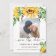 One of a kind rustic wedding save the date card features lovely bouquet of sunflowers along the top with little bouquet on the bottom right, your favourite photo, modern and script calligraphy typography used. The back of the card is solid yellow with white sunflower icon in pattern.