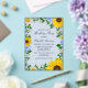Rustic country birthday invitation featuring vibrant sunflowers, traditional white daisies and colourful blue flowers against a light dusty blue background with baby's breath and botanical greenery accents