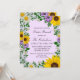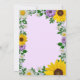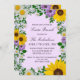 Rustic country Easter invitation featuring vibrant sunflowers, traditional white daisies and colourful purple flowers against a light purple background with baby's breath and botanical greenery accents