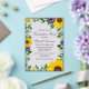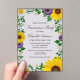 Rustic country graduation invitation featuring vibrant sunflowers, traditional white daisies and colourful purple flowers against a light purple background with baby's breath and botanical greenery accents