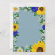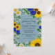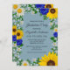Rustic country graduation invitation featuring vibrant sunflowers, traditional white daisies and navy blue flowers against a blue background with baby's breath and botanical greenery accents