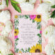 Rustic country mother's day invitation featuring vibrant sunflowers, traditional white daisies and pink flowers against a light pink background with baby's breath and botanical greenery accents