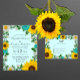 Rustic country wedding featuring vibrant sunflowers, traditional white daisies and teal flowers against a light aqua background with baby's breath and botanical greenery accents