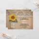 Rustic old wood background, vintage ivory lace and cute mason jar with sunflower blossom hanging on the little rope - perfect invitation for country theme bridal shower with mason jars and sunflowers accents.