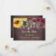 These save the date cards feature a watercolor design with sunflowers and burgundy flowers on a wood grain background with mason jar string lights. Personalise these cards with your own text. These cards are part of a collection which includes other wedding items. Please view the collection page or visit our store to see the full range.