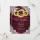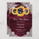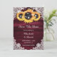 Burgundy and sunflower wedding save the date cards featuring sunflowers and white floral lace against a rustic wood background. Matching items available.