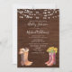 Featuring a warm wood background, this cute rustic Western wedding invitation features string lights, a pair of his boots with his cowboy hat, and a pair of her boots with sunflowers - perfect for a rustic fall wedding! The text features his and her names in popular hand lettered script typography. The back of the invitation features your favourite engagement photo. Copyright Elegant Invites, all rights reserved.