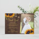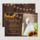 Elegant chic summer or fall wedding stylish thank you card template on brown barn wood featuring beautiful sunflowers bouquets, strings or twinkle lights, and a chic faux gold calligraphy script. ++++++++++++++ Easy to personalise with your details and photo! +++++++++++ Suitable for elegant summer or autumn fall rustic country outdoor backyard or barn weddings.