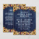 Rustic two in one budget wedding invitation printed on thinner paper with sunflowers, and flowers in blush and burgundy, and berries and sprigs against a printed blue wood look. Add your names and wedding invitation wording in rustic fonts. On the back, add your wedding details like accommodations, website, how to RSVP or anything else you need.