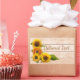 All the tough beauty of sunflowers bunched on a corner of a rustic wooden background. The design contains muted ochres, bright vibrant yellows, pink and green