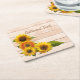 All the tough beauty of sunflowers bunched on a corner of a rustic wooden background. The design contains muted ochres, bright vibrant yellows, pink and green