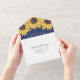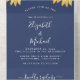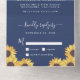 Rustic navy blue all-in-one wedding invitation featuring watercolors of yellow sunflowers, your first names in a large stylish white script and the details in simple white typography. A tear away RSVP postcard provides a convenient and eco-friendly and envelope-free response from your guests.