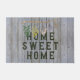 Stylish rustic country front door mat features "Home Sweet Home" text with forest cuttings graphic on faux weathered wood background