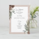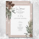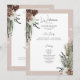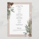 This wedding program design features a rustic green pine and pinecone bouquet on a soft tan background with white flowers. It is accented with a white sparkle overlay to illustrate the magic of the beautiful winter holidays. Perfect for a Christmas or winter wedding. Created by Simply Farmhouse Press.