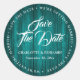 Rustic teal wedding save the date stickers featuring an elegant script font.