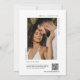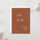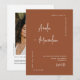 This elegant modern minimalist wedding invitation features a clean terracotta background with stylish calligraphy of the couple’s names and a simple serif font for the event details. The timeless design includes a large personalised photo of the happy couple on the back, accompanied by a QR code that allows guests to RSVP quickly and conveniently.
