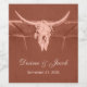 Rustic terracotta bull cow skull country western cowboy wedding reception wine bottle labels. Farmhouse inspired printed texture favours for guests. Old wild west antique style, cool, trendy, modern vintage farm animal design decor. Personalise your script. Image copyright Marg Seregelyi Photography.