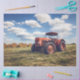 A rustic vintage-style artwork of an old tractor parked beside a field of golden hay bales.