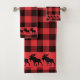 A rustic walking moose buffalo plaid towel set with red and black plaid pattern and moose silhouettes. Perfect for home bathroom decor or rustic cabin decor.