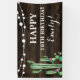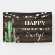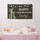 Rustic birthday party banner featuring a watercolor cactus on a barn wood background with string lights. Easily personalise using the online template tools!