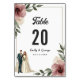 This elegant watercolor floral wedding table number is perfect for a modern wedding. The romantic design features an elegant watercolor floral frame with a bride and groom illustration and black calligraphy on a white background.