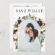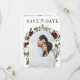 This lovely save-the-date design features watercolor pink, blush pink floral, masala, eucalyptus, and a photo on an arch. You can customise the information and add more to the back if necessary. View the collection on this page to find more matching items.