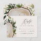Rustic watercolor floral wedding R.S.V.P reply card. Wood slice and foliage design. Elegant modern wedding range. Part of a collection