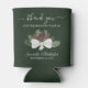 These can coolers are a fun and thoughtful way to thank your wedding guests. They feature a rustic yet beautiful forest green coloured design with elegant script lettering and a cluster of hand painted watercolor pinecones and pine branches tied with a white satin bow. The caption reads: Thank you for celebrating with us! There is room for the names of the couple and wedding date below. Perfect for an outdoor or mountain destination wedding.
