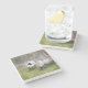This coaster features a watercolor painting print of grazing sheep by artist D. Carrasco.