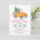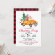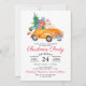 Rustic christmas winter theme party invitations featuring a simple white background, vintage yellow truck with Christmas gifts, xmas tree, and traditional party template that is easy to personalize.