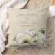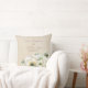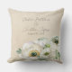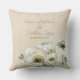 This vintage style romantic floral throw pillow features a rustic parchment paper design background with watercolor ranunculus flowers. A delicate bouquet of ranunculus and greenery is pictured on the bottom. Sample names of a newlywed couple and wedding date are printed above. You can personalise the pillow to include your own custom names or text.