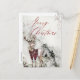 A uniquely magical rustic winter scene in muted watercolors with a deer wearing a warm woollen sweater out in the cold. A garland of poinsettias hangs around the deer's neck as though he were celebrating Christmas out in the wild. Fir trees dot the snowy mountain landscape in this charming scene. A thin handwritten script type face spells out "Merry Christmas". A text template on the back of this card includes space for your return address and a personal greeting.