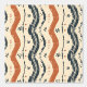 This artwork features a rustic, hand-drawn pattern of wavy lines and simple floral motifs. The design uses a warm, earthy colour palette of terracotta and deep blue against a cream background, evoking a sense of natural, organic movement. The irregular, textured lines and shapes give the pattern a handcrafted, artisanal feel, while the rhythmic flow of the waves creates a soothing and dynamic visual effect. The scattered floral and geometric elements add subtle detail and charm to the overall composition.
