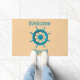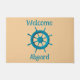 Doormat Welcome Door Mat with customisable text typography template Welcome Aboard and printed with Rustic Weathered Boat Steering Wheel Photo Image with a summer tan sand background colour is part of our always expanding original photography collections by TheFabricSeal print on demand shop at Zazzle.com #ZazzleMade ©️Original. https://www.zazzle.com/store/thefabricseal