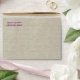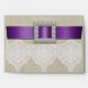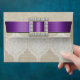 This custom wedding invitation is perfect for a rustic wedding or vintage themed wedding. It has rustic design elements with it's PRINTED beige linen background and vintage lace damask pattern, yet is sophisticated with the PRINTED purple satin ribbon and square diamond brooch which looks like costume jewellery. Elke Clarke © PLEASE NOTE ALL ELEMENTS ARE PRINTED ON THE FLAT SURFACE. A fun handwriting script font for the text of grey and purple works well with the trendy look of beige linen or burlap like fabric paired with white lace. It adds a touch of whimsy to this romantic design. For different colour ribbon please contact luxuryweddinginvitations@gmail.com