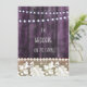 Rustic wedding invitation template featuring vintage lacework and an old farmhouse wooden wall in soft purple tones. String lights add a cosy charm, making it perfect for weddings, bridal showers, engagements, save the dates, and anniversaries. Includes front and back design by Alma Wad. Fully customisable to suit your event.