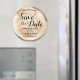The magnet features a printed wood grain cut disk design, adding a touch of natural elegance to your wedding announcement. Personalize the magnet with your wedding date, location, and the names of the bride and groom to make it a truly personalized keepsake for your guests.