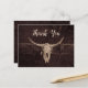 This wedding thank you postcard features a rustic country western brown bull cow skull rodeo cowboy wedding theme. Farmhouse style, old wild west vintage antique, cool, trendy, modern, stylish farm animal customised design with beautiful typography. Image copyright Marg Seregelyi Photography.