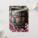 This charming rustic whiskey barrel serves as a unique wedding décor piece, featuring a weathered, aged appearance that exudes vintage elegance. Resting on a wooden platform, the barrel is topped with a sturdy lid, perfect for use as a decorative accent or functional display. A warm string of lights wrapped around a wooden post softly illuminates the dark background, creating an inviting ambiance. Delicate pink and burgundy florals frame the bottom of the scene, adding a romantic and sophisticated touch, making it an ideal setting for a rustic, barn, or country-style wedding.