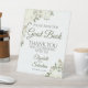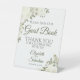 This beautiful pedestal sign will invite your wedding guests to sign your guest book. Features a rustic boho chic floral design with hand painted watercolor roses and blossoms in shades of ivory, white, and cream, along with sprigs of eucalyptus leaves and garden greenery. There is space for the names of the couple as well as the wedding date.